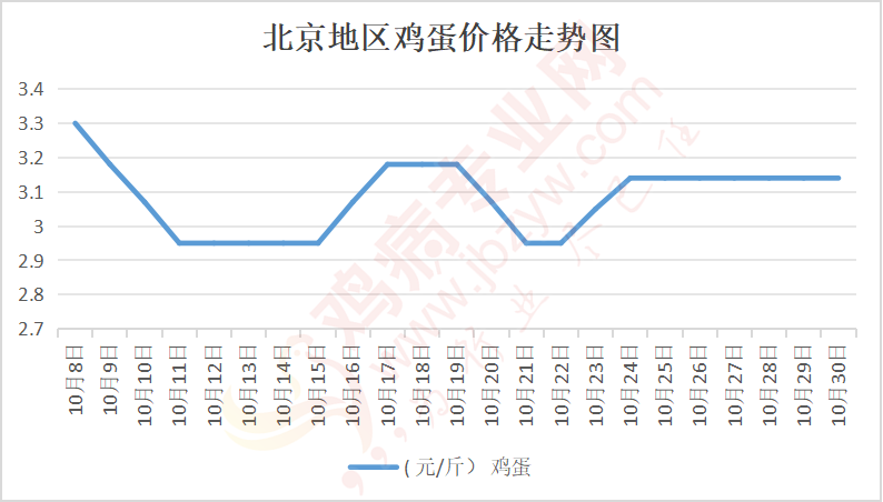 鸡病专业网消息:10月30日,北京大洋路鸡蛋主流批发价格138-139元/44斤,稳,到货7台,成交灵活,走货一般;回龙观鸡蛋138元/44斤,稳;顺义石门鸡蛋138元/44斤,稳。