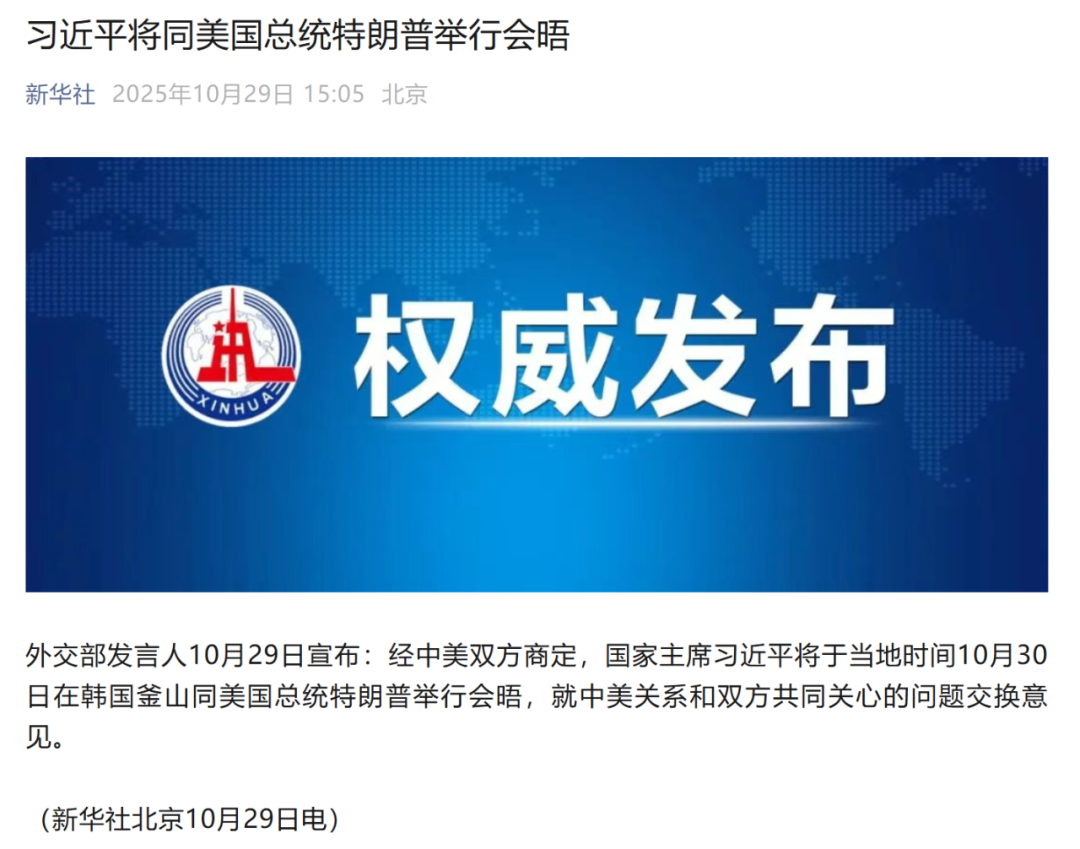 新华社消息,外交部发言人10月29日宣布:经中美双方商定,国家主席习近平将于当地时间10月30日在韩国釜山同美国总统特朗普举行会晤,就中美关系和双方共同关心的问题交换意见。
