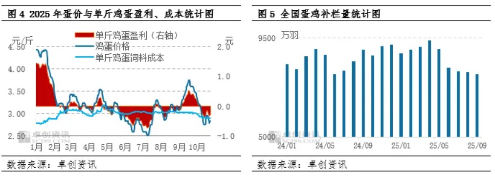 随着在产蛋鸡存栏量的持续增长,而整体需求维持相对平稳,鸡蛋供应过剩局面逐渐显现。2025年2月份在产蛋鸡存栏量突破13亿大关,供大于求矛盾加剧,鸡蛋市场承压,蛋价呈现较为明显的跌势,月均价环比跌幅超20%,饲料成本虽然有所波动,但整体调整幅度较为有限。随着蛋价跌至成本线附近,蛋鸡养殖结束了长达4年的高盈利状态,逐步进入亏损阶段。二季度养殖进入深度亏损期,单斤鸡蛋亏损超过0.5元,深度的亏损加重了养殖单位谨慎补栏心态,自5月份开始鸡苗补栏量持续下降,9月份全国蛋鸡补栏量降至7840万只,同比降幅12%左右,后续新增产能将持续收窄。