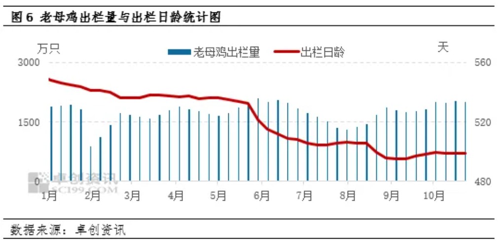 从老母鸡出栏情况看,由于三季度养殖盈利由亏转盈,养殖单位淘鸡意向下降,三季度老母鸡出栏量环比下降11.86%。但是10月份进入需求淡季,在供应压力与需求疲软双重压制下,蛋价迅速走低,养殖再次进入亏损阶段,养殖单位心态逐渐崩溃,老母鸡出栏量持续增加,10月份老母鸡周度出栏量基本维持在2000万只以上,去产能速度开始加快。