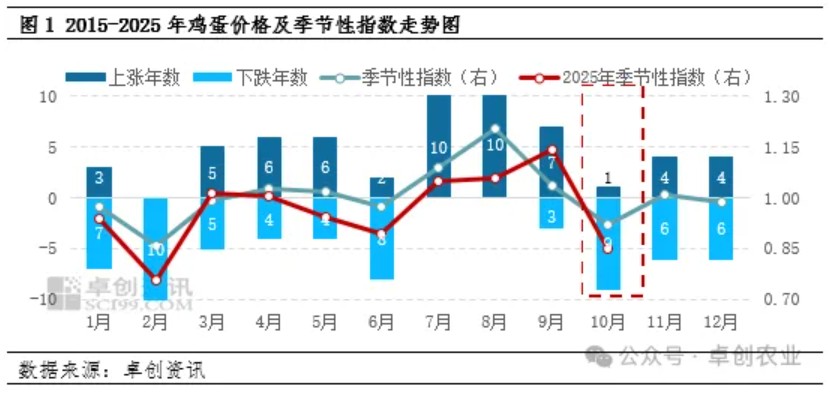【导语】10月份鸡蛋价格呈现先跌后降走势,月度均价季节性下滑。主因一方面鸡蛋产能高位,供应量延续充足状态,另一方面国庆、中秋节过后,市场需求进入消费淡季,对鸡蛋价格形成利空影响,供大于求格局下,鸡蛋月度均价呈现季节性下滑走势。后市供需压力恢复性改善,预计11-12月鸡蛋价格或处过渡性修复阶段。