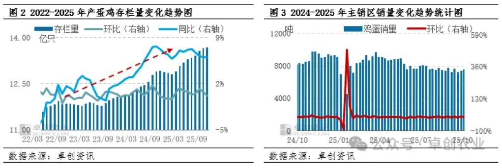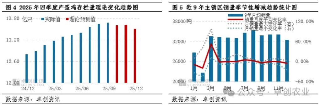 根据影响产蛋鸡存栏量的重要指标补栏量、出栏量、出栏日龄、上月存栏基数等,推断11-12月在产蛋鸡存栏量理论值或略增后下降,理论上12月份存栏量或下降至13.50亿只。但供应的降幅不及业者预期,或导致鸡蛋价格水平升高缺乏基础支撑因素,2025年四季度-2026年一季度供应仍存利空影响,但利空的程度或逐步降低。