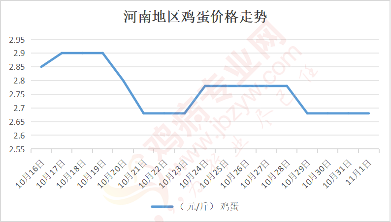鸡病专业网消息:11月1日,河南郑州鸡蛋2.7元/斤,稳;新密鸡蛋2.7元/斤,稳;荥阳鸡蛋2.7元/斤,稳;中牟鸡蛋2.7元/斤,稳;周口鸡蛋2.65元/斤,稳;商丘鸡蛋80-81元/30斤,稳;鹤壁鸡蛋2.65元/斤,稳;汝州鸡蛋2.65元/斤,稳;开封鸡蛋80-81元/30斤,稳;漯河鸡蛋2.65元/斤,稳;漯河临颍鸡蛋2.65元/斤,稳;许昌鸡蛋2.7元/斤,稳;南阳鸡蛋2.65元/斤,稳;南阳邓州鸡蛋2.65元/斤,稳;新乡鸡蛋2.65元/斤,稳;安阳鸡蛋2.65元/斤,稳;新郑鸡蛋2.7元/斤,稳;登封鸡蛋2.7元/斤,稳;平顶山鸡蛋2.7元/斤,稳;驻马店鸡蛋2.7元/斤,稳;三门峡鸡蛋2.7元/斤,稳;焦作鸡蛋2.65元/斤,稳;信阳鸡蛋2.65元/斤,稳;濮阳鸡蛋2.65元/斤,稳。