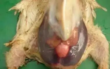 心包积液综合征的剖检病变主要为心包腔内有黄色清亮水样或胶冻样液体,心肌柔软,有坏死点;肝脏肿大、质脆易碎、有坏死灶;脾脏肿大;肺水肿、充血等。该病潜伏期较短,一般少于2天,3-5周龄鸡突然死亡,死亡率可达80%,持续1周左右,以后死亡数量开始减少,病程9-15天。