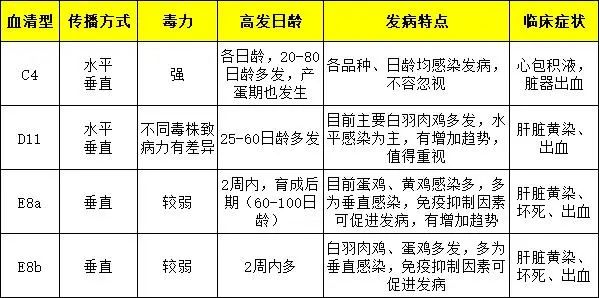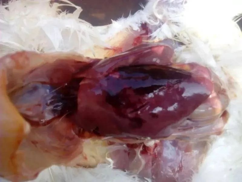 急性病鸡死前产蛋正常,营养状况良好,特点为纸壳色、黄褐色腹泻,一般无其他明显症状,猝死。慢性病鸡发病较慢,病程较长,与其他病原混感,发病率和死亡率很高。病鸡采食量下降、消瘦、精神不振、呆立迟钝,鸡冠苍白、鳞片状皱缩、有皮屑,腹部膨大有波动感,蛋壳质量差,产蛋率下降较快,排黄白绿色稀便,糊肛。剖检病死鸡可见腹腔血水,肝脏肿大质脆、星状坏死灶或出血斑或菜花样黄白色坏死区(特征性病变),肝破裂,肝被膜下有大小不一的血肿,肝被膜黄染,脾脏肿大、出血、坏死、易碎,肠粘膜脱落,肠道内有黏液、有灰色稀便,卵泡萎缩变形,心包积液,心肌褪色苍白变性,肾脏苍白、肿大、出血,胆囊肿胀,胆汁稀薄。注意与脂肪肝综合征、戊型肝炎、包涵体肝炎、白血病等的鉴别诊断。
