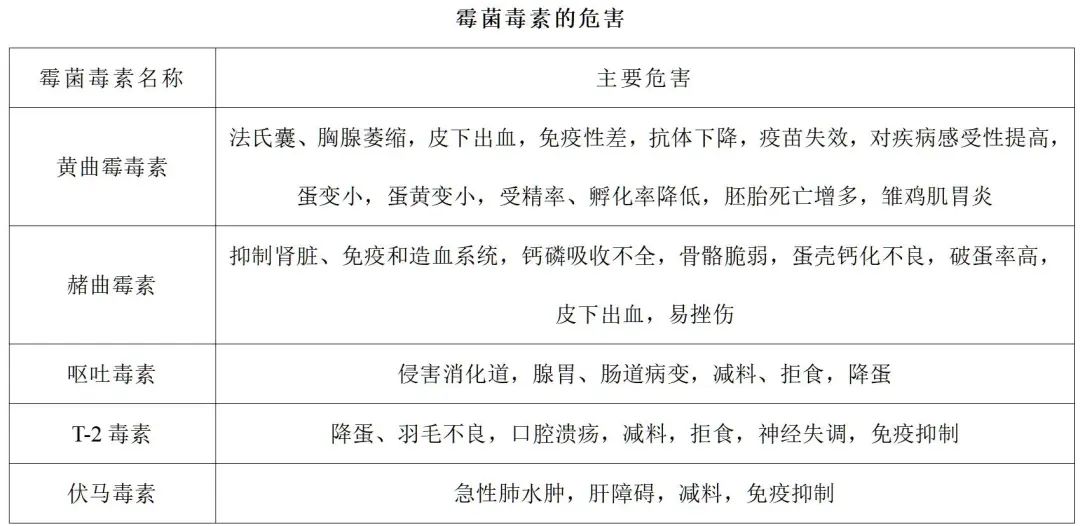 霉菌毒素可引起免疫抑制、繁殖障碍、肝胆损伤、肝肾毒性、消化道损伤、基因突变等。主要表现为鸡冠苍白、倒冠、羽毛生长不良、顽固性腹泻、吐水、采食速度慢、过料、饲料转化率降低、降蛋、蛋壳质量下降、受精率和孵化率下降等,以及口腔溃疡、食道炎、嗉囊炎、腺胃肿胀、腺胃乳头出血、肌胃角质糜烂溃疡出血、脂肪肝、肠粘膜坏死脱落出血、肾脏尿酸盐沉积、腹水、神经紊乱等。在对肝脏的危害方面,可导致肝脏多灶性增生、肝细胞坏死,肿大似橡皮肝,质脆易碎,应激情况下易肝破裂出血。霉菌毒素引起免疫抑制,可导致疫苗抗体不达标,鸡群免疫力低、抵抗力差,易感染发病,增加经济损失。