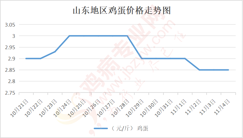 鸡病专业网消息:11月4日,山东地区莱阳鸡蛋2.9元/斤,稳;青岛鸡蛋2.9元/斤,稳;诸城鸡蛋2.9元/斤,稳;安丘鸡蛋2.8元/斤,稳;昌乐鸡蛋2.8元/斤,稳;寿光鸡蛋2.8元/斤,稳;昌邑鸡蛋2.8元/斤,稳;高密鸡蛋2.9元/斤,稳;青州鸡蛋2.8元/斤,稳;临朐鸡蛋2.8元/斤,稳;莱州鸡蛋2.9元/斤,稳;威海鸡蛋2.9元/斤,稳;临沭鸡蛋2.8元/斤,稳;沂水鸡蛋2.8元/斤,稳;沂南鸡蛋2.8元/斤,稳;莒南鸡蛋2.8元/斤,稳;兰陵县鸡蛋2.8元/斤,稳;日照鸡蛋2.8元/斤,稳;莒县鸡蛋2.8元/斤,稳;日照辛萁商贸鸡蛋2.8元/斤,稳;泗水鸡蛋价格81元/30斤,稳;济宁、汶上鸡蛋价格81元/30斤,稳;梁山、东平红蛋价格81元/30斤,稳;枣庄滕州地区鸡蛋混码主流到户83元/30斤,稳;泰安地区新泰鸡蛋价格81元/30斤,稳;菏泽地区曹县主流到户81元/30斤,稳;成武鸡蛋价格81元/30斤,稳;单县到户81元/30斤,稳;聊城莘县80元/30斤,稳。