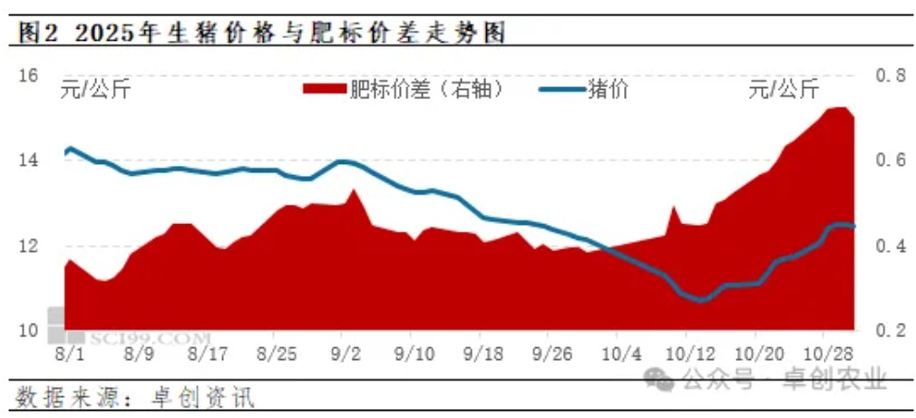 一方面,标猪价格重心上移,南北地区,主流产区标猪报价回升至6~6.5元/斤,受此影响,二次育肥补栏成本大幅上涨,相比10月中旬的低值,补栏标猪头均花销增加近200块钱,这抑制了二育的积极性!尤其是,前期二育集中入场,这势必会增加中大猪出栏后置的表现,二育对于猪价前景看涨信心略有减弱,毕竟,按照产能变化,四季度标猪供应维持过剩的局面。且,生猪合约走势不佳,国内2511合约以及2601合约较差,市场看涨猪价前景缺乏信心!
