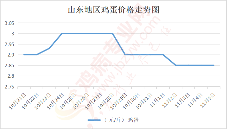 鸡病专业网消息:11月5日,山东地区莱阳鸡蛋2.9元/斤,稳;青岛鸡蛋2.9元/斤,稳;诸城鸡蛋2.9元/斤,稳;安丘鸡蛋2.8元/斤,稳;昌乐鸡蛋2.8元/斤,稳;寿光鸡蛋2.8元/斤,稳;昌邑鸡蛋2.8元/斤,稳;高密鸡蛋2.9元/斤,稳;青州鸡蛋2.8元/斤,稳;临朐鸡蛋2.8元/斤,稳;莱州鸡蛋2.9元/斤,稳;威海鸡蛋2.9元/斤,稳;临沭鸡蛋2.8元/斤,稳;沂水鸡蛋2.8元/斤,稳;沂南鸡蛋2.8元/斤,稳;莒南鸡蛋2.8元/斤,稳;兰陵县鸡蛋2.8元/斤,稳;日照鸡蛋2.8元/斤,稳;莒县鸡蛋2.8元/斤,稳;日照辛萁商贸鸡蛋2.8元/斤,稳;泗水鸡蛋价格81元/30斤,稳;济宁、汶上鸡蛋价格81元/30斤,稳;梁山、东平红蛋价格81元/30斤,稳;枣庄滕州地区鸡蛋混码主流到户83元/30斤,稳;泰安地区新泰鸡蛋价格81元/30斤,稳;菏泽地区曹县主流到户81元/30斤,稳;成武鸡蛋价格81元/30斤,稳;单县到户81元/30斤,稳;聊城莘县80元/30斤,稳。