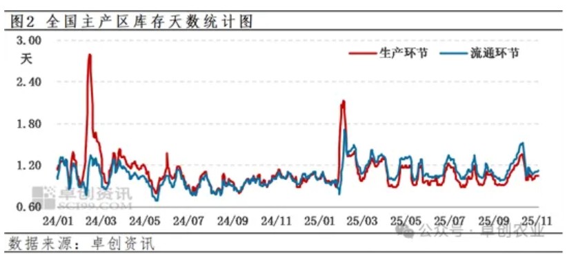 库存:今日全国生产环节平均库存1.05天左右,流通环节库存1.12天左右,市场走货略有放缓,库存略增。