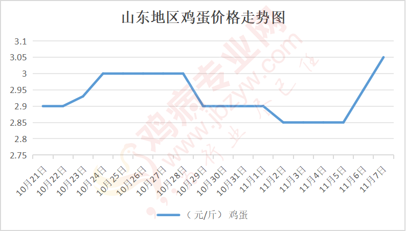 鸡病专业网消息:11月7日,山东地区莱阳鸡蛋3.1元/斤,涨;青岛鸡蛋3.1元/斤,涨;诸城鸡蛋3.1元/斤,涨;安丘鸡蛋3元/斤,涨;昌乐鸡蛋3元/斤,涨;寿光鸡蛋3元/斤,涨;昌邑鸡蛋3元/斤,涨;高密鸡蛋3.1元/斤,涨;青州鸡蛋3元/斤,涨;临朐鸡蛋3元/斤,涨;莱州鸡蛋3.1元/斤,涨;威海鸡蛋3.1元/斤,涨;临沭鸡蛋3元/斤,涨;沂水鸡蛋3元/斤,涨;沂南鸡蛋3元/斤,涨;莒南鸡蛋3元/斤,涨;兰陵县鸡蛋3元/斤,涨;日照鸡蛋3元/斤,涨;莒县鸡蛋3元/斤,涨;日照辛萁商贸鸡蛋3元/斤,涨;泗水鸡蛋价格87元/30斤,涨;济宁、汶上鸡蛋价格87元/30斤,涨;梁山、东平红蛋价格87元/30斤,涨;枣庄滕州地区鸡蛋混码主流到户89元/30斤,涨;泰安地区新泰鸡蛋价格87元/30斤,涨;菏泽地区曹县主流到户87元/30斤,涨;成武鸡蛋价格87元/30斤,涨;单县到户87元/30斤,涨;聊城莘县87元/30斤,涨。