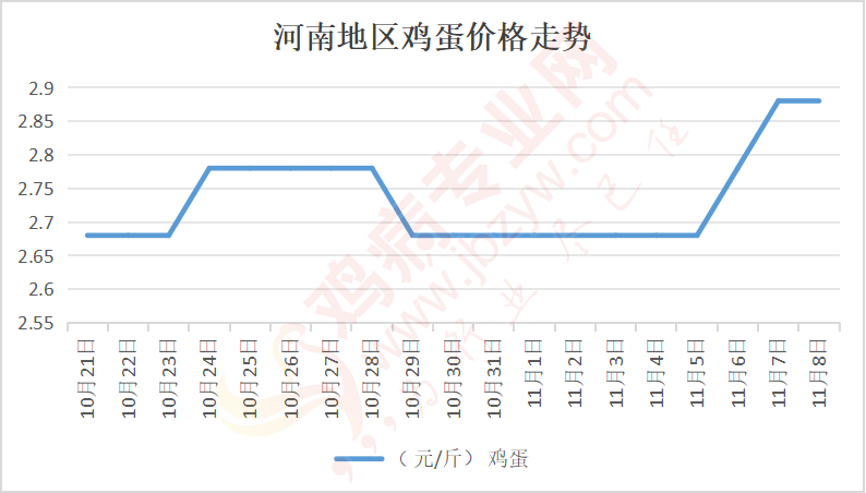鸡病专业网消息:11月8日,河南郑州鸡蛋2.9元/斤,稳;新密鸡蛋2.9元/斤,稳;荥阳鸡蛋2.9元/斤,稳;中牟鸡蛋2.9元/斤,稳;周口鸡蛋2.85元/斤,稳;商丘鸡蛋87元/30斤,稳;鹤壁鸡蛋2.85元/斤,稳;汝州鸡蛋2.85元/斤,稳;开封鸡蛋86-87元/30斤,稳;漯河鸡蛋2.85元/斤,稳;漯河临颍鸡蛋2.85元/斤,稳;许昌鸡蛋2.9元/斤,稳;南阳鸡蛋2.85元/斤,稳;南阳邓州鸡蛋2.85元/斤,稳;新乡鸡蛋2.85元/斤,稳;安阳鸡蛋2.85元/斤,稳;新郑鸡蛋2.9元/斤,稳;登封鸡蛋2.9元/斤,稳;平顶山鸡蛋2.9元/斤,稳;驻马店鸡蛋2.9元/斤,稳;三门峡鸡蛋2.9元/斤,稳;焦作鸡蛋2.85元/斤,稳;信阳鸡蛋2.85元/斤,稳;濮阳鸡蛋2.85元/斤,稳。