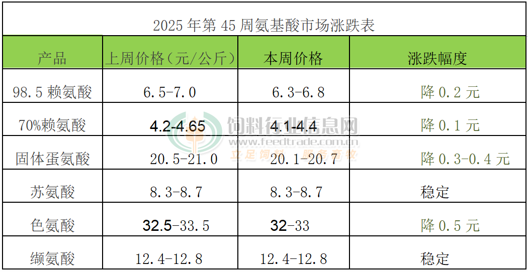 赖氨酸市场中,98%赖氨酸参考报价区间6.3-6.8元/公斤,70%赖氨酸参考报价区间4.1-4.4元/公斤。2025年9月,我国赖氨酸与赖氨酸盐及酯的出口量为7.9万吨,同比降18.5%,环比增5.2%。本周市场称成福80%赖氨酸报价4.75元/公斤,70%赖氨酸报价4.15元/公斤。80%赖氨酸产能释放,加上出口放缓,赖氨酸市场供应充裕,稳中偏弱运行。