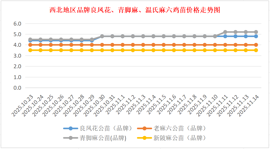 品牌新陂麻:价格稳定,到户价公苗4.50元/羽,稳。