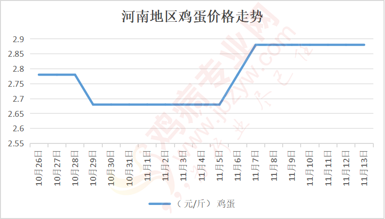 鸡病专业网消息:11月13日,河南郑州鸡蛋2.9元/斤,稳;新密鸡蛋2.9元/斤,稳;荥阳鸡蛋2.9元/斤,稳;中牟鸡蛋2.9元/斤,稳;周口鸡蛋2.85元/斤,稳;商丘鸡蛋87元/30斤,稳;鹤壁鸡蛋2.85元/斤,稳;汝州鸡蛋2.85元/斤,稳;开封鸡蛋86-87元/30斤,稳;漯河鸡蛋2.85元/斤,稳;漯河临颍鸡蛋2.85元/斤,稳;许昌鸡蛋2.9元/斤,稳;南阳鸡蛋2.85元/斤,稳;南阳邓州鸡蛋2.85元/斤,稳;新乡鸡蛋2.85元/斤,稳;安阳鸡蛋2.85元/斤,稳;新郑鸡蛋2.9元/斤,稳;登封鸡蛋2.9元/斤,稳;平顶山鸡蛋2.9元/斤,稳;驻马店鸡蛋2.9元/斤,稳;三门峡鸡蛋2.9元/斤,稳;焦作鸡蛋2.85元/斤,稳;信阳鸡蛋2.85元/斤,稳;濮阳鸡蛋2.85元/斤,稳。
