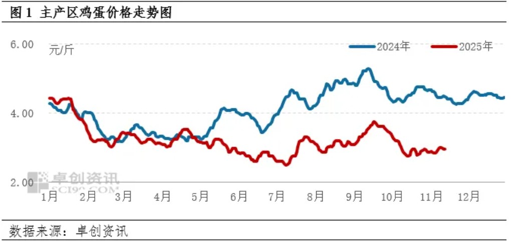 受供应压力持续增加、需求跟进有限压制,11月上旬主产区鸡蛋价格同环比下滑。11月中下旬需求缓慢修复,蛋价或缓慢上移,但供应压力持续释放或压制蛋价的涨幅。