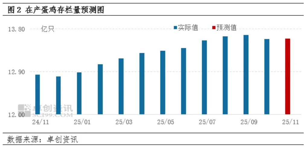 存栏去化难度大,供应压力不减。11月中下旬养殖企业老母鸡出栏进度或偏慢,部分或压栏至春节前出栏,产能去化速度较慢。尽管新开产蛋鸡数量略有减少,但新开产蛋鸡数量或大于老母鸡出栏量,预计在产蛋鸡存栏量或增加至13.60亿只左右,在产蛋鸡存栏量仍然处于近五年高点,来自供应端的压力不减。