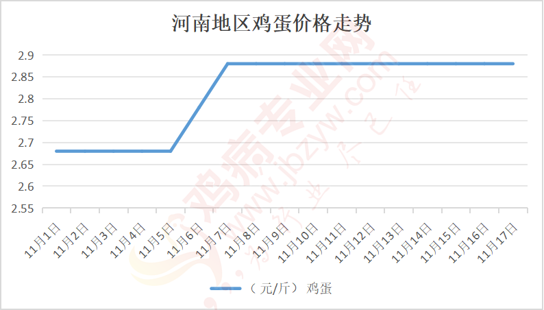鸡病专业网消息:11月17日,河南郑州鸡蛋2.9元/斤,稳;新密鸡蛋2.9元/斤,稳;荥阳鸡蛋2.9元/斤,稳;中牟鸡蛋2.9元/斤,稳;周口鸡蛋2.85元/斤,稳;商丘鸡蛋87元/30斤,稳;鹤壁鸡蛋2.85元/斤,稳;汝州鸡蛋2.85元/斤,稳;开封鸡蛋86-87元/30斤,稳;漯河鸡蛋2.85元/斤,稳;漯河临颍鸡蛋2.85元/斤,稳;许昌鸡蛋2.9元/斤,稳;南阳鸡蛋2.85元/斤,稳;南阳邓州鸡蛋2.85元/斤,稳;新乡鸡蛋2.85元/斤,稳;安阳鸡蛋2.85元/斤,稳;新郑鸡蛋2.9元/斤,稳;登封鸡蛋2.9元/斤,稳;平顶山鸡蛋2.9元/斤,稳;驻马店鸡蛋2.9元/斤,稳;三门峡鸡蛋2.9元/斤,稳;焦作鸡蛋2.85元/斤,稳;信阳鸡蛋2.85元/斤,稳;濮阳鸡蛋2.85元/斤,稳。