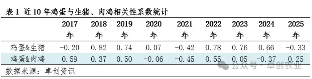 鸡蛋与生猪作为我国居民动物蛋白的主要来源,二者价格相关性呈现明显的阶段性特征。根据卓创数据监测分析,2018-2019年及2023-2024年期间,蛋猪价格相关性系数均超过0.75,表现出高度正相关;而在2017、2020、2025年等年份,相关性却出现负值。这种波动背后是生猪市场特有的周期规律与鸡蛋市场供需变化的复杂互动,即当生猪价格发生极值变化时,对鸡蛋的替代效应最为显著,例如2018-2019年非洲猪瘟导致猪肉供应骤减,猪肉价格飙升,消费者转而增加鸡蛋采购,推动蛋价同步上涨,形成价格联动。而在生猪供应稳定、价格平稳的时期,两者价格关联度明显减弱,甚至出现反向走势,其中2025年生猪与鸡蛋价格相关性系数为-0.33,虽从数据端体现两者替代减弱,但另一方面在畜牧行业多产品供大于求的背景下,供应增加压制了流通端的低价出清能力,消费者对于蛋白类需求提升空间有限,单品价格在常规条件下难以突破重围,形成了一种“此消彼长”的替代格局。