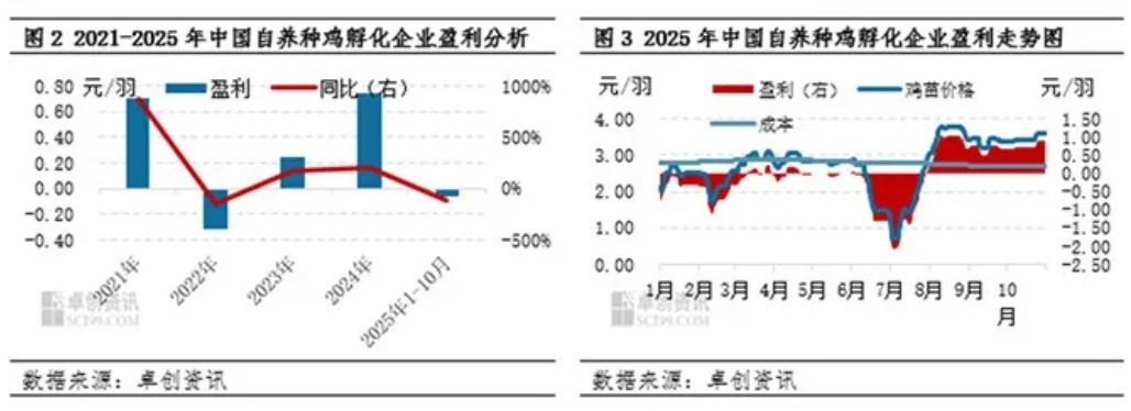 成本与收入双向挤压,构成孵化环节盈利的核心变量。2021-2025年孵化企业利润呈现“降-增-降”波动态势,2025年降至近五年次低水平。年内走势显著分化:上半年,商品代鸡苗价格持续低位,而前期引种的父母代苗价处于高位,叠加饲料成本上涨,孵化环节深陷亏损;下半年苗价反弹拉动收入回升,企业逐步扭亏为盈。