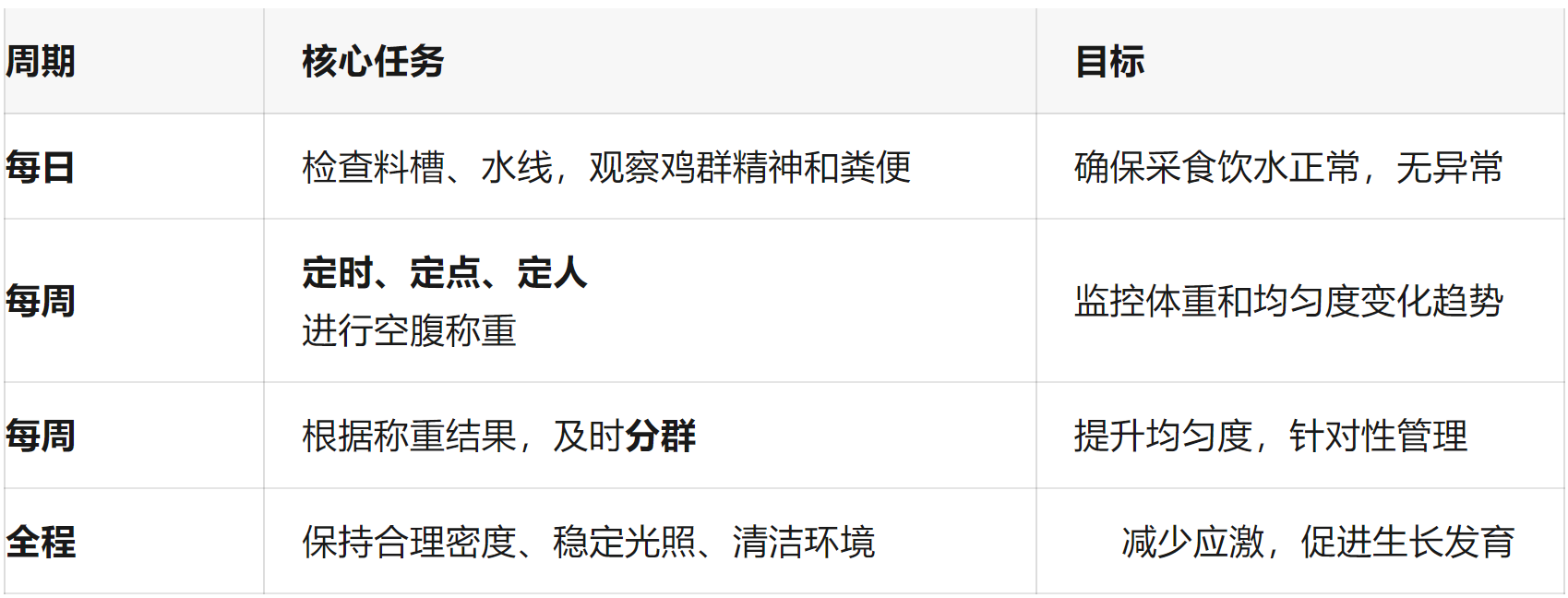 定期称重:从4周龄开始,每周固定时间随机抽取5%的鸡只(至少100只)进行空腹称重。