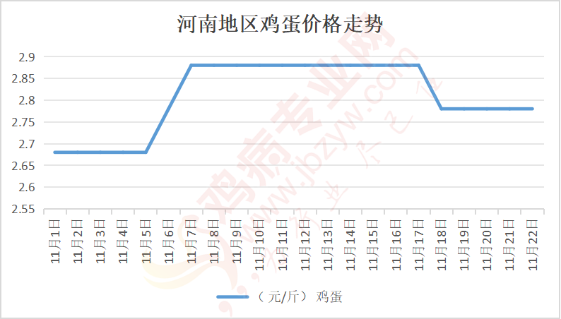 鸡病专业网消息:11月22日,河南郑州鸡蛋2.8元/斤,稳;新密鸡蛋2.8元/斤,稳;荥阳鸡蛋2.8元/斤,稳;中牟鸡蛋2.8元/斤,稳;周口鸡蛋2.75元/斤,稳;商丘鸡蛋84元/30斤,稳;鹤壁鸡蛋2.75元/斤,稳;汝州鸡蛋2.75元/斤,稳;开封鸡蛋83-84元/30斤,稳;漯河鸡蛋2.75元/斤,稳;漯河临颍鸡蛋2.75元/斤,稳;许昌鸡蛋2.8元/斤,稳;南阳鸡蛋2.75元/斤,稳;南阳邓州鸡蛋2.75元/斤,稳;新乡鸡蛋2.75元/斤,稳;安阳鸡蛋2.75元/斤,稳;新郑鸡蛋2.8元/斤,稳;登封鸡蛋2.8元/斤,稳;平顶山鸡蛋2.8元/斤,稳;驻马店鸡蛋2.8元/斤,稳;三门峡鸡蛋2.8元/斤,稳;焦作鸡蛋2.75元/斤,稳;信阳鸡蛋2.75元/斤,稳;濮阳鸡蛋2.75元/斤,稳。