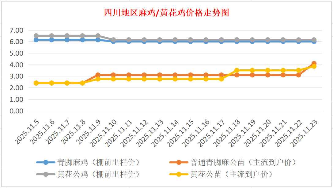 普通青脚麻公苗:价格上涨,主流到户价4.00-4.20元/羽,涨。