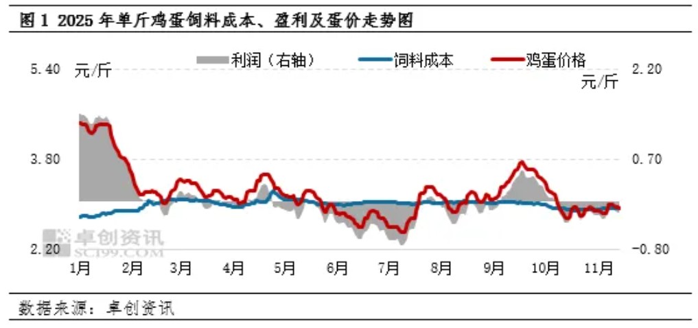 数据是市场最直接的语言。回顾2025年下半年,鸡蛋价格持续在3.00元/斤上下徘徊,截至11月13日,主产区鸡蛋均价3.08元/斤,而单斤鸡蛋饲料成本却达到了3.00元,养殖端盈利状况持续欠佳。并且截至11月13日,下半年单斤鸡蛋的平均利润为-0.12元,而进入11月以后,形势进一步加重,单斤鸡蛋利润降至-0.20元,较10月平均水平减少0.03元。利润的持续下滑,导致企业现金流与生存空间持续挤压,四季度迎来了淘鸡加速的基本面现状。