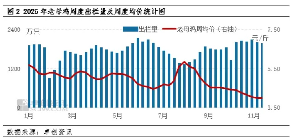 2025年蛋鸡养殖行业迎来了深刻的周期性调整。在持续的价格低迷与盈利压力下,市场自发启动了供需平衡机制。养殖端通过加速淘汰低效产能以应对困局,但是这种“自救”行为却加剧了短期市场的波动,即老母鸡出栏量的急剧增加及价格的不断下滑。但是这种周期性的波动,也是为未来价格修复奠定了基础。