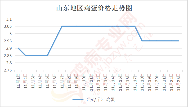 鸡病专业网消息:11月23日,山东地区莱阳鸡蛋2.95元/斤,稳;青岛鸡蛋2.95元/斤,稳;诸城鸡蛋3元/斤,稳;安丘鸡蛋2.9元/斤,稳;昌乐鸡蛋2.9元/斤,稳;寿光鸡蛋2.9元/斤,稳;昌邑鸡蛋2.9元/斤,稳;高密鸡蛋3元/斤,稳;青州鸡蛋2.9元/斤,稳;临朐鸡蛋2.9元/斤,稳;莱州鸡蛋2.95元/斤,稳;威海鸡蛋2.95元/斤,稳;临沭鸡蛋2.9元/斤,稳;沂水鸡蛋2.9元/斤,稳;沂南鸡蛋2.9元/斤,稳;莒南鸡蛋2.9元/斤,稳;兰陵县鸡蛋2.9元/斤,稳;日照鸡蛋2.9元/斤,稳;莒县鸡蛋2.9元/斤,稳;日照辛萁商贸鸡蛋2.9元/斤,稳;泗水鸡蛋价格84元/30斤,稳;济宁、汶上鸡蛋价格84元/30斤,稳;梁山、东平红蛋价格84元/30斤,稳;枣庄滕州地区鸡蛋混码主流到户86元/30斤,稳;泰安地区新泰鸡蛋价格84元/30斤,稳;菏泽地区曹县主流到户84元/30斤,稳;成武鸡蛋价格84元/30斤,稳;单县到户84元/30斤,稳;聊城莘县84元/30斤,稳。