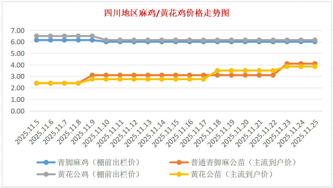 普通青脚麻公苗:价格稳定,主流到户价4.00-4.20元/羽,稳。