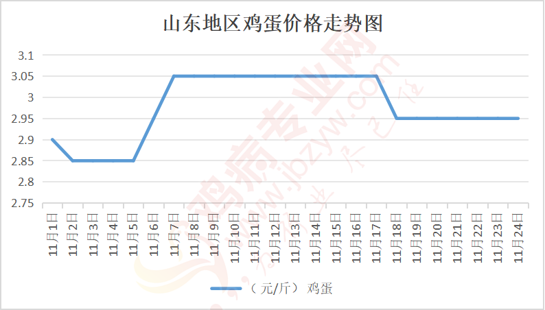 鸡病专业网消息:11月24日,山东地区莱阳鸡蛋2.95元/斤,稳;青岛鸡蛋2.95元/斤,稳;诸城鸡蛋3元/斤,稳;安丘鸡蛋2.9元/斤,稳;昌乐鸡蛋2.9元/斤,稳;寿光鸡蛋2.9元/斤,稳;昌邑鸡蛋2.9元/斤,稳;高密鸡蛋3元/斤,稳;青州鸡蛋2.9元/斤,稳;临朐鸡蛋2.9元/斤,稳;莱州鸡蛋2.95元/斤,稳;威海鸡蛋2.95元/斤,稳;临沭鸡蛋2.9元/斤,稳;沂水鸡蛋2.9元/斤,稳;沂南鸡蛋2.9元/斤,稳;莒南鸡蛋2.9元/斤,稳;兰陵县鸡蛋2.9元/斤,稳;日照鸡蛋2.9元/斤,稳;莒县鸡蛋2.9元/斤,稳;日照辛萁商贸鸡蛋2.9元/斤,稳;泗水鸡蛋价格84元/30斤,稳;济宁、汶上鸡蛋价格84元/30斤,稳;梁山、东平红蛋价格84元/30斤,稳;枣庄滕州地区鸡蛋混码主流到户86元/30斤,稳;泰安地区新泰鸡蛋价格84元/30斤,稳;菏泽地区曹县主流到户84元/30斤,稳;成武鸡蛋价格84元/30斤,稳;单县到户84元/30斤,稳;聊城莘县84元/30斤,稳。