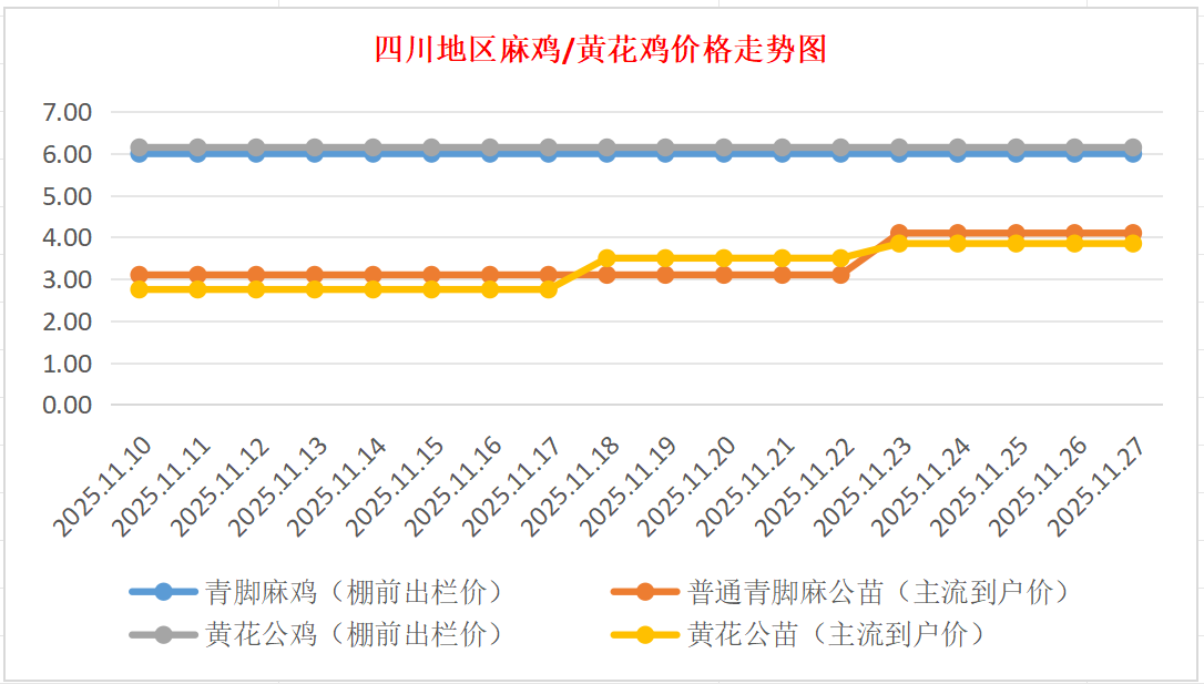 普通青脚麻公苗:价格稳定,主流到户价4.00-4.20元/羽,稳。