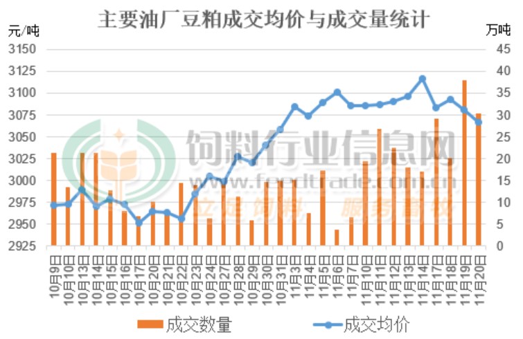 随着近期气温逐渐下降,国内畜禽养殖即将迎来一年中的需求旺季,加之目前国内生猪及家禽存栏均处于偏高的水平,对饲料的消耗总量较大,对豆粕的需求也将逐渐上量。饲料养殖企业为满足生猪及家禽旺盛的需求,提前备货需求增多。据相关统计数据显示,自立冬以来饲料养殖企业及贸易商备货的需求出现了明显的增加,近日还出现成交放量的情况,这在大豆压榨利润不佳的情况下增强工厂对豆粕的挺价动力,不过从成交均价来看,价格并未持续上涨,而是出现回调的走势。