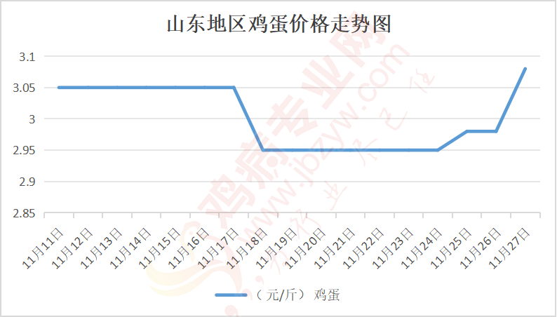 鸡病专业网消息:11月27日,山东地区莱阳鸡蛋3.1元/斤,稳;青岛鸡蛋3.1元/斤,稳;诸城鸡蛋3.1元/斤,稳;安丘鸡蛋3.05元/斤,涨;昌乐鸡蛋3.05元/斤,涨;寿光鸡蛋3.05元/斤,涨;昌邑鸡蛋3.05元/斤,涨;高密鸡蛋3.1元/斤,稳;青州鸡蛋3.05元/斤,涨;临朐鸡蛋3.05元/斤,涨;莱州鸡蛋3.1元/斤,稳;威海鸡蛋3.1元/斤,稳;临沭鸡蛋3.05元/斤,涨;沂水鸡蛋3.05元/斤,涨;沂南鸡蛋3.05元/斤,涨;莒南鸡蛋3.05元/斤,涨;兰陵县鸡蛋3.05元/斤,涨;日照鸡蛋3.05元/斤,涨;莒县鸡蛋3.05元/斤,涨;日照辛萁商贸鸡蛋3.05元/斤,涨;泗水鸡蛋价格90元/斤,涨;济宁、汶上鸡蛋价格90元/斤,涨;梁山、东平红蛋价格90元/斤,涨;枣庄滕州地区鸡蛋混码主流到户91元/30斤,稳;泰安地区新泰鸡蛋价格90元/斤,涨;菏泽地区曹县主流到户90元/斤,涨;成武鸡蛋价格90元/斤,涨;单县到户90元/斤,涨;聊城莘县90元/斤,涨。