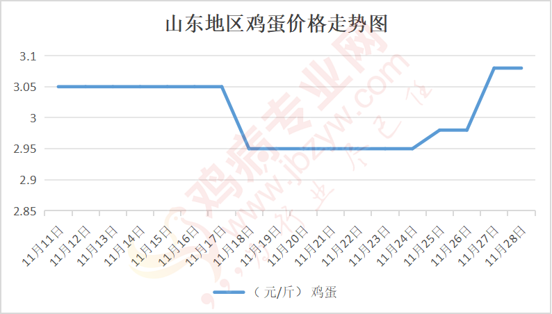 鸡病专业网消息:11月28日,山东地区莱阳鸡蛋3.1元/斤,稳;青岛鸡蛋3.1元/斤,稳;诸城鸡蛋3.1元/斤,稳;安丘鸡蛋3.05元/斤,稳;昌乐鸡蛋3.05元/斤,稳;寿光鸡蛋3.05元/斤,稳;昌邑鸡蛋3.05元/斤,稳;高密鸡蛋3.1元/斤,稳;青州鸡蛋3.05元/斤,稳;临朐鸡蛋3.05元/斤,稳;莱州鸡蛋3.1元/斤,稳;威海鸡蛋3.1元/斤,稳;临沭鸡蛋3.05元/斤,稳;沂水鸡蛋3.05元/斤,稳;沂南鸡蛋3.05元/斤,稳;莒南鸡蛋3.05元/斤,稳;兰陵县鸡蛋3.05元/斤,稳;日照鸡蛋3.05元/斤,稳;莒县鸡蛋3.05元/斤,稳;日照辛萁商贸鸡蛋3.05元/斤,稳;泗水鸡蛋价格90元/斤,稳;济宁、汶上鸡蛋价格90元/斤,稳;梁山、东平红蛋价格90元/斤,稳;枣庄滕州地区鸡蛋混码主流到户91元/30斤,稳;泰安地区新泰鸡蛋价格90元/斤,稳;菏泽地区曹县主流到户90元/斤,稳;成武鸡蛋价格90元/斤,稳;单县到户90元/斤,稳;聊城莘县90元/斤,稳。