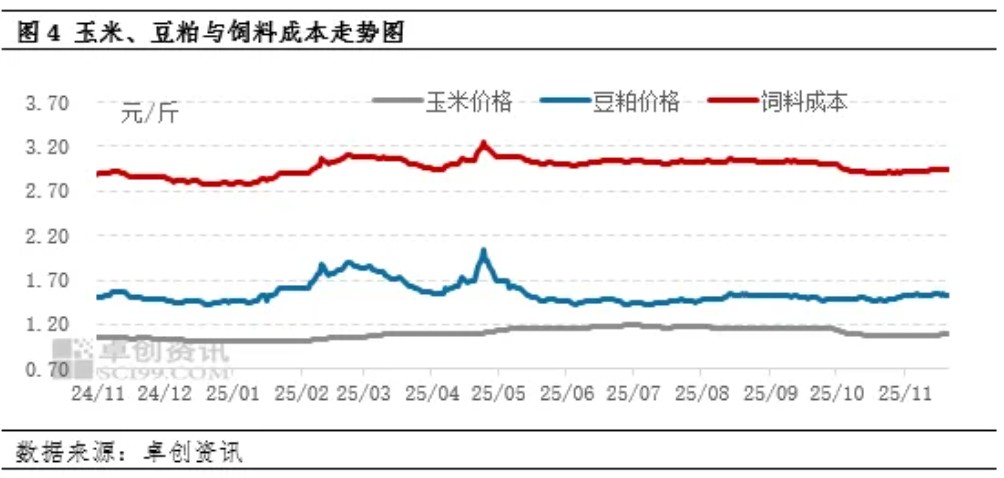 饲料原料价格涨势不强。玉米方面,东北产区基层售粮意愿偏低,市场有效供应量增速放缓,市场价格或整体偏强,但12月中下旬基层或短时增量,价格或阶段性回调。豆粕方面,近期东北大豆市场运行平稳,在国储收购价发布后,市场情绪有所降温,预计短期价格偏稳运行。而随着中国大量采购美豆落地,后期供应预期宽松,低蛋白价格有望承压下行。整体而言,12月份饲料原料价格上涨动力不强,后期或稍显弱势,因此预计12月份饲料成本增幅不大。