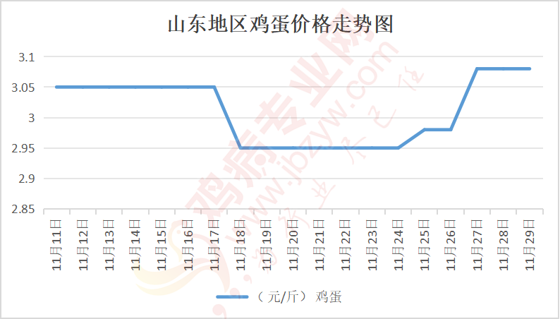 鸡病专业网消息:11月29日,山东地区莱阳鸡蛋3.1元/斤,稳;青岛鸡蛋3.1元/斤,稳;诸城鸡蛋3.1元/斤,稳;安丘鸡蛋3.05元/斤,稳;昌乐鸡蛋3.05元/斤,稳;寿光鸡蛋3.05元/斤,稳;昌邑鸡蛋3.05元/斤,稳;高密鸡蛋3.1元/斤,稳;青州鸡蛋3.05元/斤,稳;临朐鸡蛋3.05元/斤,稳;莱州鸡蛋3.1元/斤,稳;威海鸡蛋3.1元/斤,稳;临沭鸡蛋3.05元/斤,稳;沂水鸡蛋3.05元/斤,稳;沂南鸡蛋3.05元/斤,稳;莒南鸡蛋3.05元/斤,稳;兰陵县鸡蛋3.05元/斤,稳;日照鸡蛋3.05元/斤,稳;莒县鸡蛋3.05元/斤,稳;日照辛萁商贸鸡蛋3.05元/斤,稳;泗水鸡蛋价格90元/斤,稳;济宁、汶上鸡蛋价格90元/斤,稳;梁山、东平红蛋价格90元/斤,稳;枣庄滕州地区鸡蛋混码主流到户91元/30斤,稳;泰安地区新泰鸡蛋价格90元/斤,稳;菏泽地区曹县主流到户90元/斤,稳;成武鸡蛋价格90元/斤,稳;单县到户90元/斤,稳;聊城莘县90元/斤,稳。