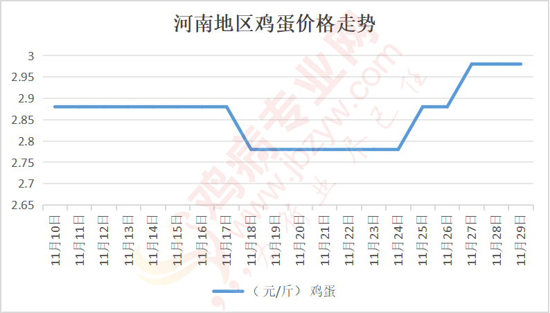 鸡病专业网消息:11月29日,河南郑州鸡蛋3元/斤,稳;新密鸡蛋3元/斤,稳;荥阳鸡蛋3元/斤,稳;中牟鸡蛋3元/斤,稳;周口鸡蛋2.95元/斤,稳;商丘鸡蛋90元/30斤,稳;鹤壁鸡蛋2.95元/斤,稳;汝州鸡蛋2.95元/斤,稳;开封鸡蛋90元/30斤,稳;漯河鸡蛋2.95元/斤,稳;漯河临颍鸡蛋2.95元/斤,稳;许昌鸡蛋3元/斤,稳;南阳鸡蛋2.95元/斤,稳;南阳邓州鸡蛋2.95元/斤,稳;新乡鸡蛋2.95元/斤,稳;安阳鸡蛋2.95元/斤,稳;新郑鸡蛋3元/斤,稳;登封鸡蛋3元/斤,稳;平顶山鸡蛋3元/斤,稳;驻马店鸡蛋3元/斤,稳;三门峡鸡蛋3元/斤,稳;焦作鸡蛋2.95元/斤,稳;信阳鸡蛋2.95元/斤,稳;濮阳鸡蛋2.95元/斤,稳。