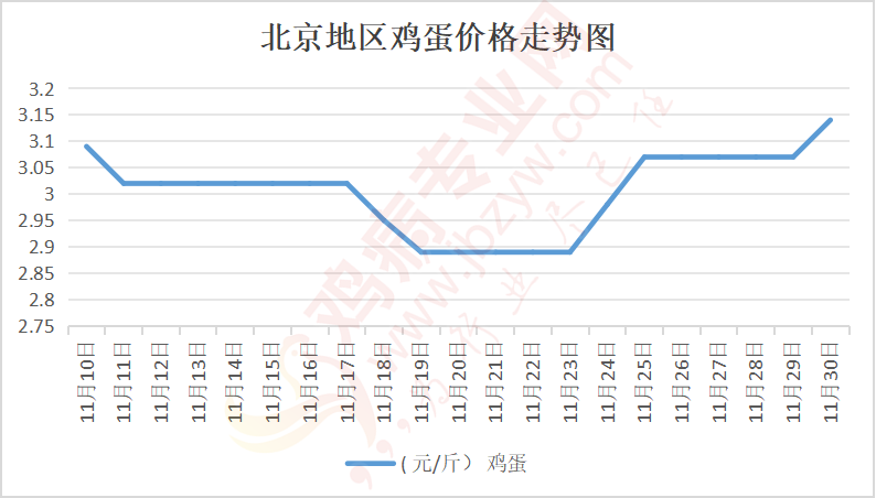 鸡病专业网消息:11月30日,北京大洋路鸡蛋主流批发价格138-139元/44斤,涨,到货5台车,成交灵活,走货一般;回龙观鸡蛋138元/44斤,涨;顺义石门鸡蛋138元/44斤,涨。