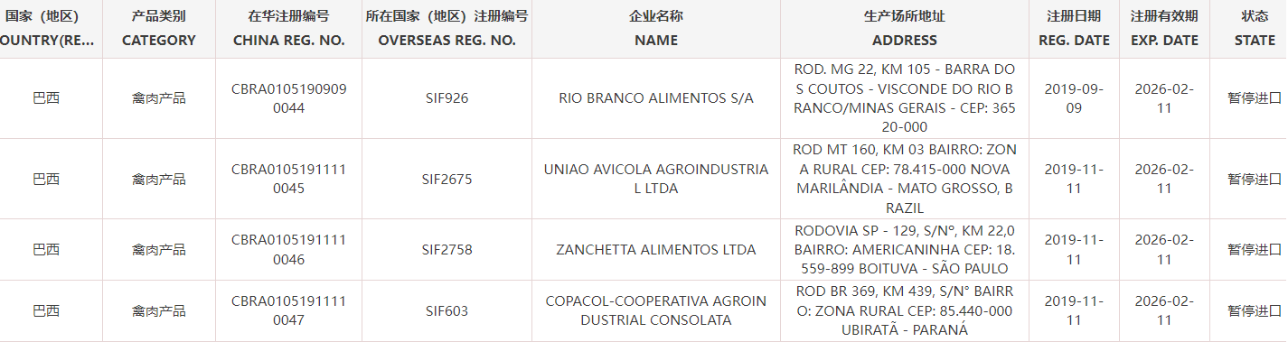 海关总署更新进口食品境外生产企业注册信息,暂停受理巴西6家注册编号为SIF4087、SIF664、SIF926、SIF2675、SIF2758、SIF603的禽肉产品企业自2025年11月28日(含)起启运的输华禽肉产品进口申报。