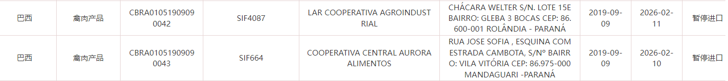 海关准入更新:暂停巴西6家禽肉厂输华!