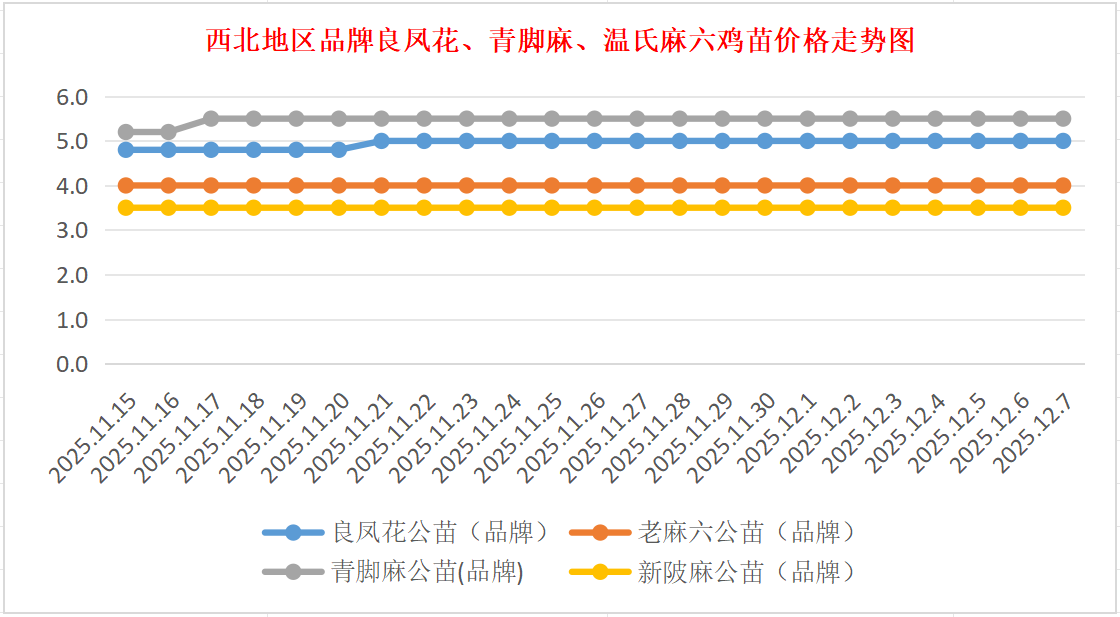 品牌新陂麻:价格稳定,到户价公苗4.50元/羽,稳。