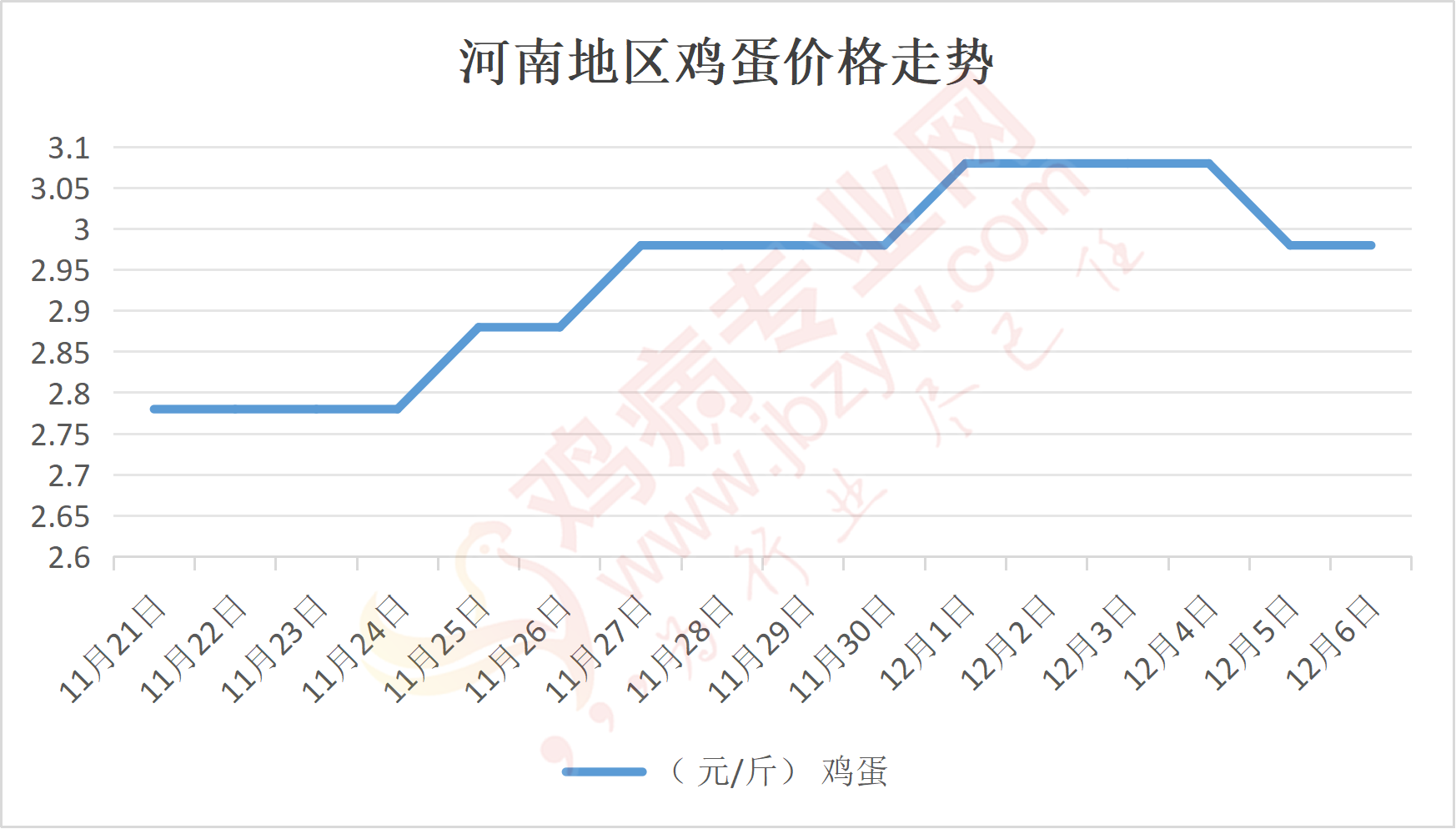 鸡病专业网消息:12月6日,河南郑州鸡蛋3元/斤,稳;新密鸡蛋3元/斤,稳;荥阳鸡蛋3元/斤,稳;中牟鸡蛋3元/斤,稳;周口鸡蛋2.95元/斤,稳;商丘鸡蛋90元/30斤,稳;鹤壁鸡蛋2.95元/斤,稳;汝州鸡蛋2.95元/斤,稳;开封鸡蛋90元/30斤,稳;漯河鸡蛋2.95元/斤,稳;漯河临颍鸡蛋2.95元/斤,稳;许昌鸡蛋3元/斤,稳;南阳鸡蛋2.95元/斤,稳;南阳邓州鸡蛋2.95元/斤,稳;新乡鸡蛋2.95元/斤,稳;安阳鸡蛋2.95元/斤,稳;新郑鸡蛋3元/斤,稳;登封鸡蛋3元/斤,稳;平顶山鸡蛋3元/斤,稳;驻马店鸡蛋3元/斤,稳;三门峡鸡蛋3元/斤,稳;焦作鸡蛋2.95元/斤,稳;信阳鸡蛋2.95元/斤,稳;濮阳鸡蛋2.95元/斤,稳。
