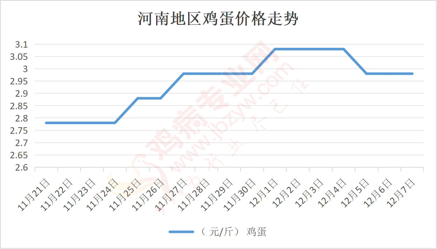 鸡病专业网消息:12月7日,河南郑州鸡蛋3元/斤,稳;新密鸡蛋3元/斤,稳;荥阳鸡蛋3元/斤,稳;中牟鸡蛋3元/斤,稳;周口鸡蛋2.95元/斤,稳;商丘鸡蛋90元/30斤,稳;鹤壁鸡蛋2.95元/斤,稳;汝州鸡蛋2.95元/斤,稳;开封鸡蛋90元/30斤,稳;漯河鸡蛋2.95元/斤,稳;漯河临颍鸡蛋2.95元/斤,稳;许昌鸡蛋3元/斤,稳;南阳鸡蛋2.95元/斤,稳;南阳邓州鸡蛋2.95元/斤,稳;新乡鸡蛋2.95元/斤,稳;安阳鸡蛋2.95元/斤,稳;新郑鸡蛋3元/斤,稳;登封鸡蛋3元/斤,稳;平顶山鸡蛋3元/斤,稳;驻马店鸡蛋3元/斤,稳;三门峡鸡蛋3元/斤,稳;焦作鸡蛋2.95元/斤,稳;信阳鸡蛋2.95元/斤,稳;濮阳鸡蛋2.95元/斤,稳。