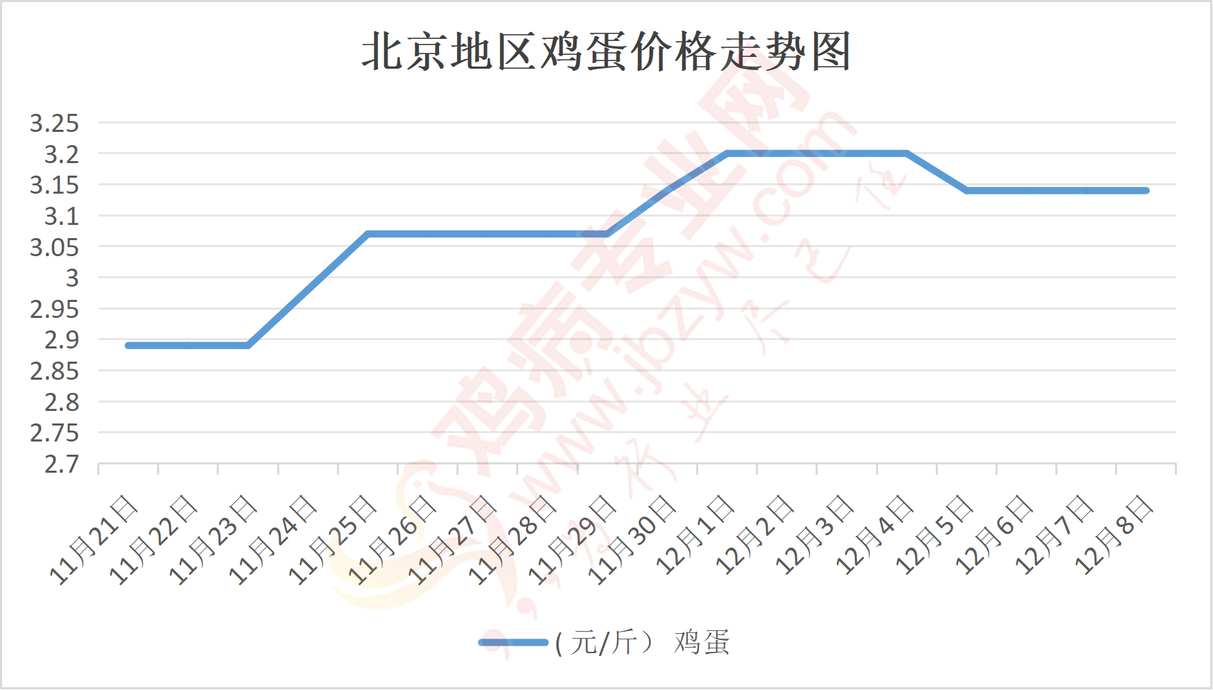 鸡病专业网消息:12月8日,北京大洋路鸡蛋主流批发价格138-139元/44斤,稳,到货4台车,成交灵活,走货稍快;回龙观鸡蛋138元/44斤,稳;顺义石门鸡蛋138元/44斤,稳。