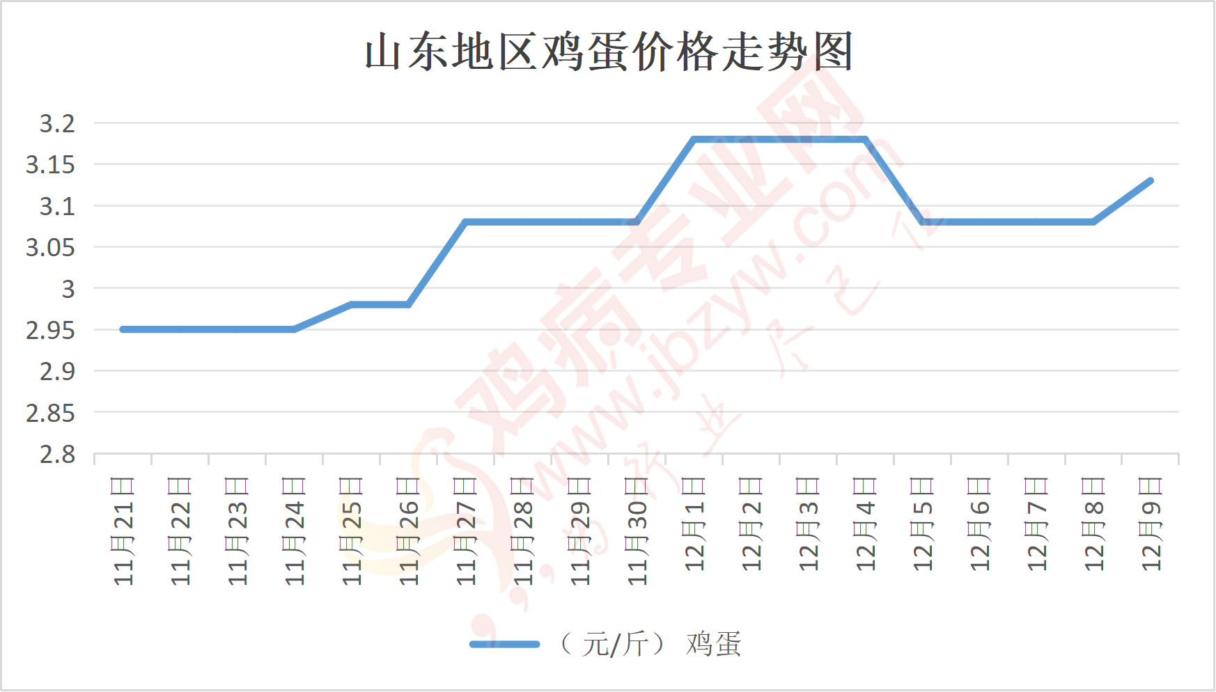 鸡病专业网消息:12月9日,山东地区莱阳鸡蛋3.2元/斤,涨;青岛鸡蛋3.2元/斤,涨;诸城鸡蛋3.15元/斤,涨;安丘鸡蛋3.05元/斤,稳;昌乐鸡蛋3.05元/斤,稳;寿光鸡蛋3.05元/斤,稳;昌邑鸡蛋3.05元/斤,稳;高密鸡蛋3.15元/斤,涨;青州鸡蛋3.05元/斤,稳;临朐鸡蛋3.05元/斤,稳;莱州鸡蛋3.2元/斤,涨;威海鸡蛋3.2元/斤,涨;临沭鸡蛋3.05元/斤,稳;沂水鸡蛋3.05元/斤,稳;沂南鸡蛋3.05元/斤,稳;莒南鸡蛋3.05元/斤,稳;兰陵县鸡蛋3.05元/斤,稳;日照鸡蛋3.05元/斤,稳;莒县鸡蛋3.05元/斤,稳;日照辛萁商贸鸡蛋3.05元/斤,稳;泗水鸡蛋价格90元/斤,稳;济宁、汶上鸡蛋价格90元/斤,稳;梁山、东平红蛋价格90元/斤,稳;枣庄滕州地区鸡蛋混码主流到户91元/30斤,稳;泰安地区新泰鸡蛋价格90元/斤,稳;菏泽地区曹县主流到户90元/斤,稳;成武鸡蛋价格90元/斤,稳;单县到户90元/斤,稳;聊城莘县90元/斤,稳。