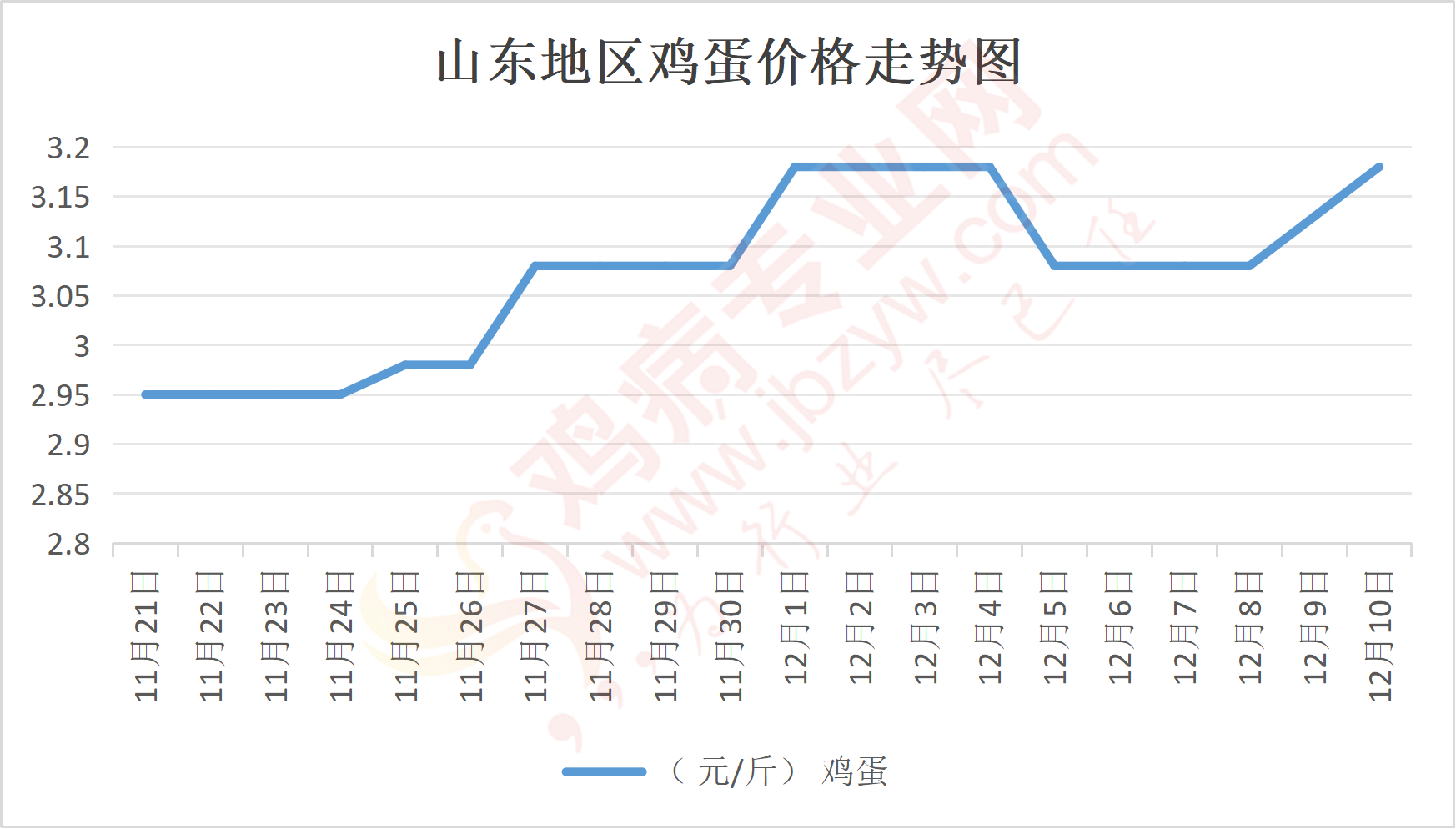 鸡病专业网消息:12月10日,山东地区莱阳鸡蛋3.25元/斤,涨;青岛鸡蛋3.25元/斤,涨;诸城鸡蛋3.25元/斤,涨;安丘鸡蛋3.1元/斤,涨;昌乐鸡蛋3.1元/斤,涨;寿光鸡蛋3.1元/斤,涨;昌邑鸡蛋3.1元/斤,涨;高密鸡蛋3.15元/斤,涨;青州鸡蛋3.1元/斤,涨;临朐鸡蛋3.1元/斤,涨;莱州鸡蛋3.2元/斤,涨;威海鸡蛋3.2元/斤,涨;临沭鸡蛋3.1元/斤,涨;沂水鸡蛋3.1元/斤,涨;沂南鸡蛋3.1元/斤,涨;莒南鸡蛋3.1元/斤,涨;兰陵县鸡蛋3.1元/斤,涨;日照鸡蛋3.1元/斤,涨;莒县鸡蛋3.1元/斤,涨;日照辛萁商贸鸡蛋3.1元/斤,涨;泗水鸡蛋价格90元/斤,稳;济宁、汶上鸡蛋价格90元/斤,稳;梁山、东平红蛋价格90元/斤,稳;枣庄滕州地区鸡蛋混码主流到户91元/30斤,稳;泰安地区新泰鸡蛋价格90元/斤,稳;菏泽地区曹县主流到户90元/斤,稳;成武鸡蛋价格90元/斤,稳;单县到户90元/斤,稳;聊城莘县90元/斤,稳。