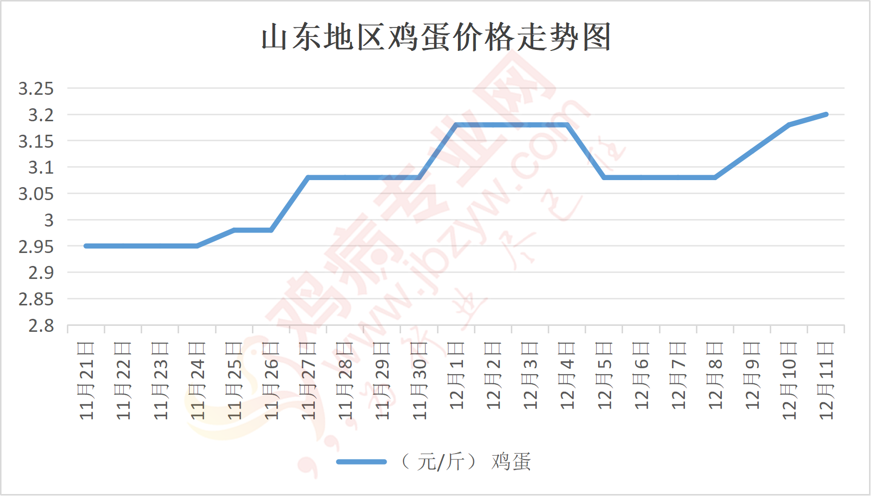 鸡病专业网消息:12月11日,山东地区莱阳鸡蛋3.25元/斤,稳;青岛鸡蛋3.25元/斤,稳;诸城鸡蛋3.25元/斤,稳;安丘鸡蛋3.15元/斤,涨;昌乐鸡蛋3.15元/斤,涨;寿光鸡蛋3.15元/斤,涨;昌邑鸡蛋3.15元/斤,涨;高密鸡蛋3.25元/斤,稳;青州鸡蛋3.15元/斤,涨;临朐鸡蛋3.15元/斤,涨;莱州鸡蛋3.25元/斤,稳;威海鸡蛋3.25元/斤,稳;临沭鸡蛋3.2元/斤,涨;沂水鸡蛋3.2元/斤,涨;沂南鸡蛋3.2元/斤,涨;莒南鸡蛋3.2元/斤,涨;兰陵县鸡蛋3.2元/斤,涨;日照鸡蛋3.2元/斤,涨;莒县鸡蛋3.2元/斤,涨;日照辛萁商贸鸡蛋3.2元/斤,涨;泗水鸡蛋价格93元/斤,涨;济宁、汶上鸡蛋价格93元/斤,涨;梁山、东平红蛋价格93元/斤,涨;枣庄滕州地区鸡蛋混码主流到户94元/30斤,涨;泰安地区新泰鸡蛋价格93元/斤,涨;菏泽地区曹县主流到户93元/斤,涨;成武鸡蛋价格93元/斤,涨;单县到户93元/斤,涨;聊城莘县93元/斤,涨。