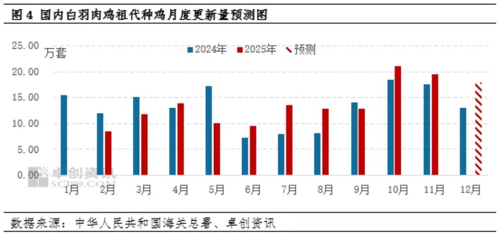 前三季度国内白羽肉鸡祖代种鸡月度更新量多不及15万套,加之年初受禽流感影响,1-2月更新量不及10万套,因此业内多预计2025年祖代种鸡更新量或在130万套左右。进入四季度,祖代种鸡引种量骤增,月度更新量多在20万套左右,因此2025年祖代种鸡总更新量有望达150万套。